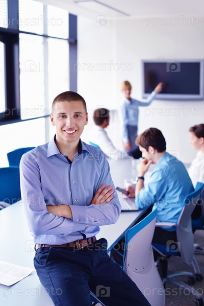 Деловой человек с коллеги на заднем плане в офисе