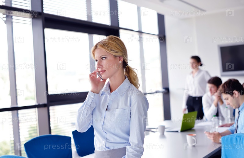 Деловая женщина с ее сотрудники на заднем плане в офисе