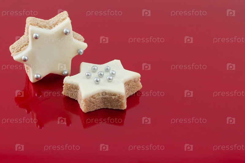 Два рождественских печенья в форме звезды на красном рождественском фоне