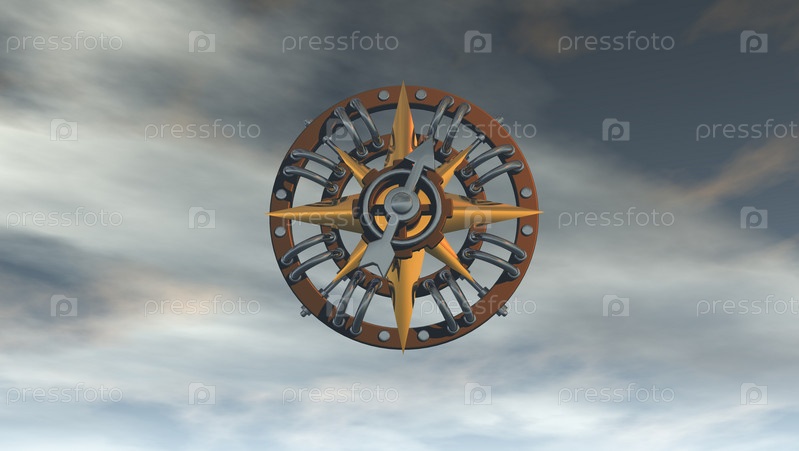 Компас на облачном небе. 3D иллюстрация