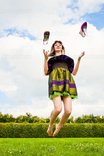 Улыбающаяся девушка с длинными каштановыми волосами прыгает на зеленом лугу