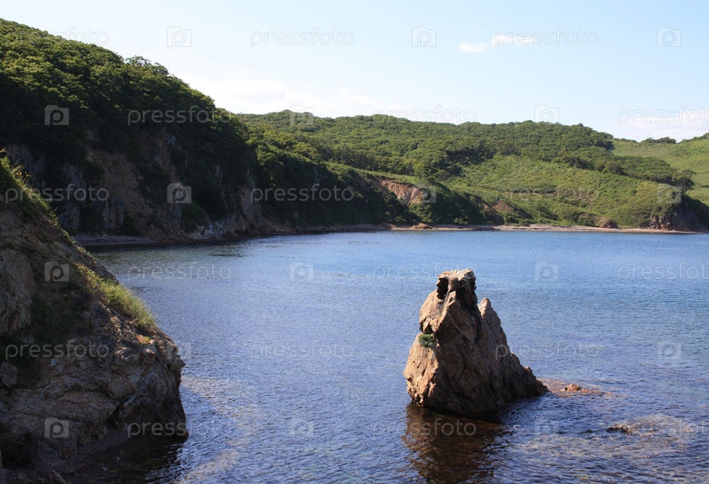 Каменистый пляж на берегу острова Путятин. Россия