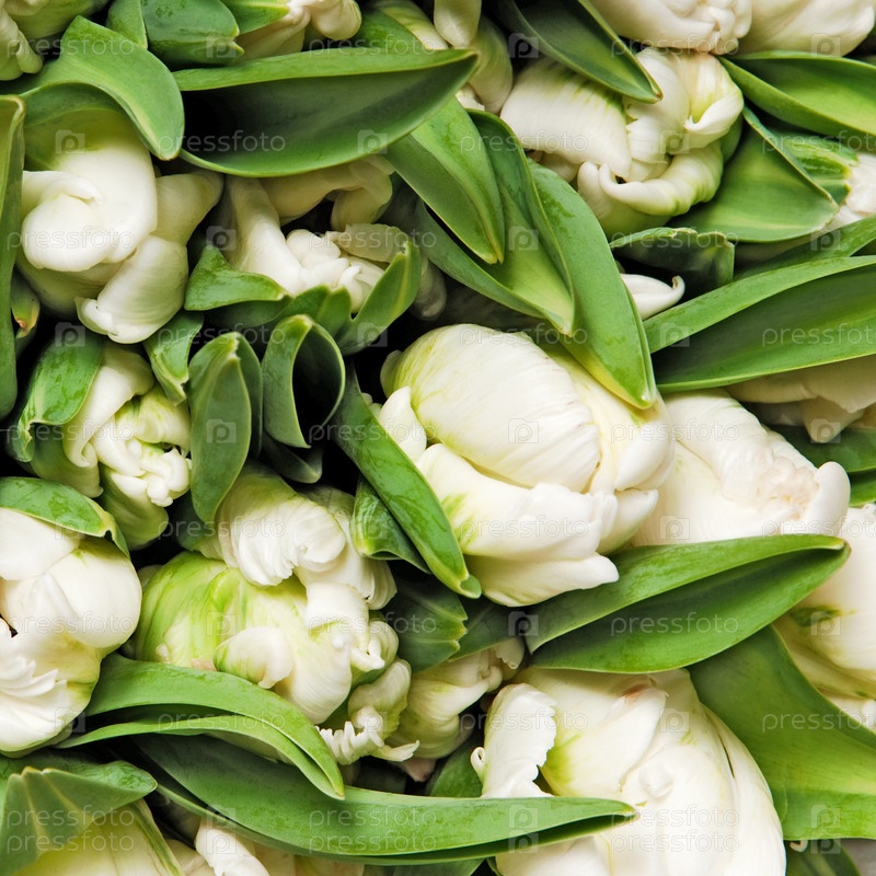 Белые тюльпаны с листьями крупным планом