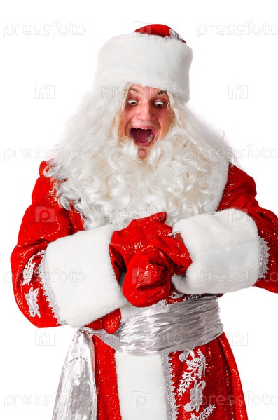 Санта-Клаус смотрит на его часы, изолированный на белом