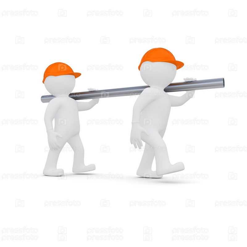 Два рабочих в касках несут металлическую трубу