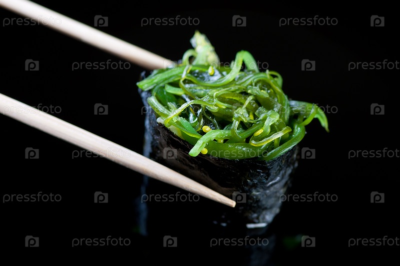 Палочки держат суши с салатом чука
