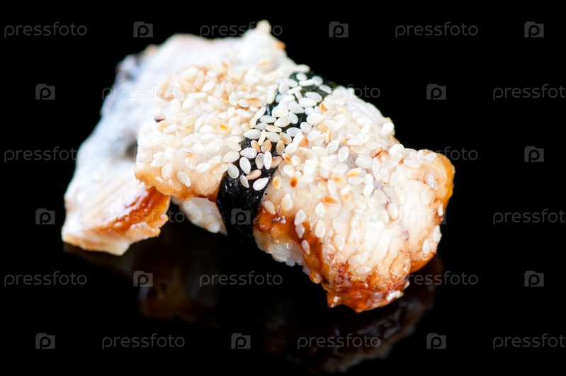 Суши с угрем на черной тарелке