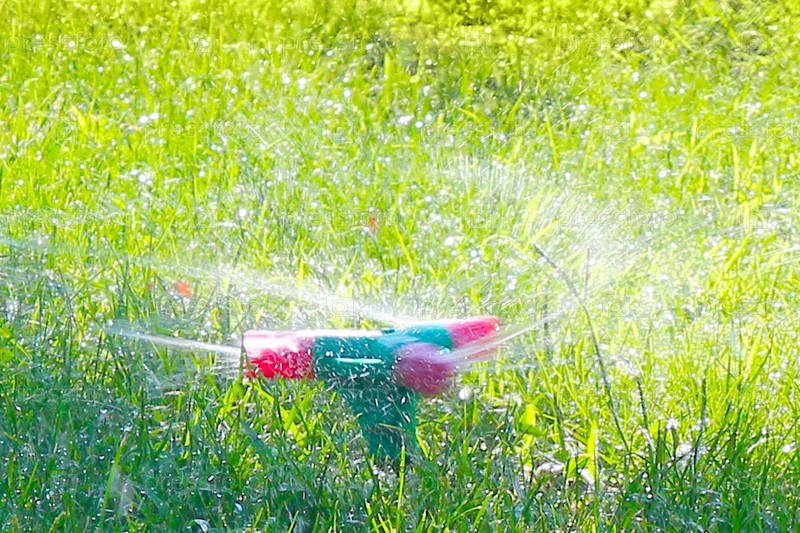 Красивая зеленая трава и водный разбрызгиватель как символ лета