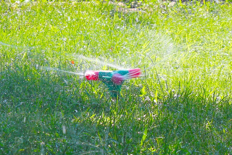 Красивая зеленая трава и водный разбрызгиватель как символ лета
