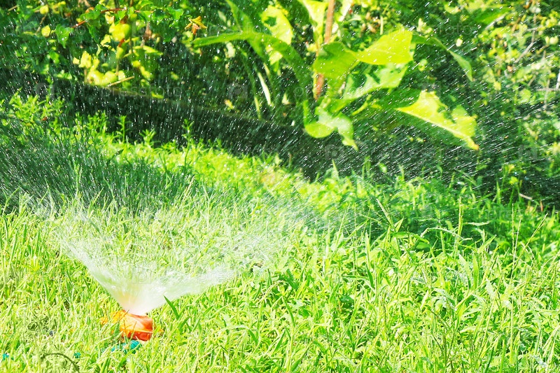 Красивая зеленая трава и водный разбрызгиватель как символ лета