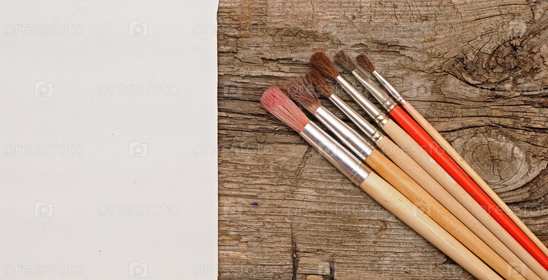 Кисти и белый лист на старом деревянном фоне