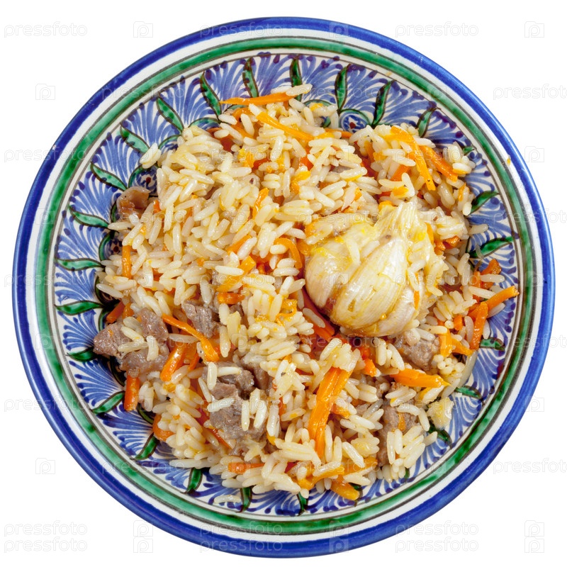 Традиционный азиатский плов с головкой чесноком в керамической тарелке