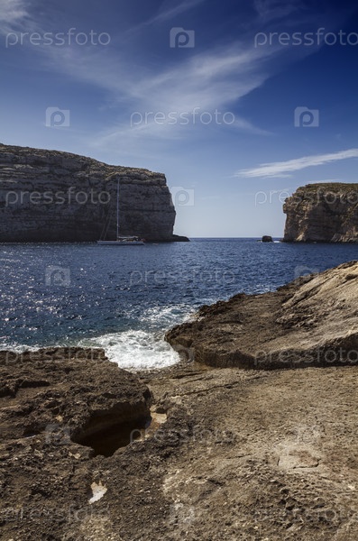 Мальта, остров Гозо, залив Двейра, парусник и скалистое побережье вблизи Грибной скалы