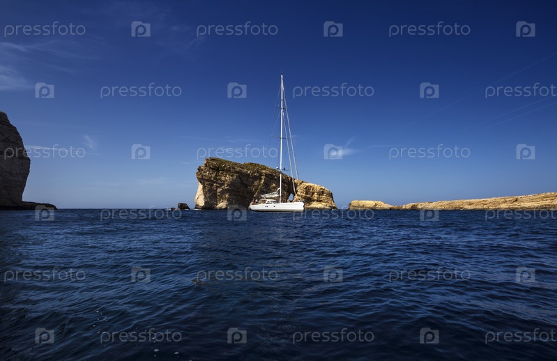 Мальта, остров Гозо, залив Двейра, парусник и скалистое побережье вблизи Грибной скалы