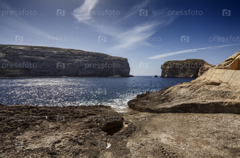 Мальта, остров Гозо, залив Двейра, парусник и скалистое побережье вблизи Грибной скалы