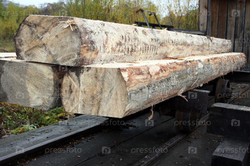 Большие бревна на металлической тележке
