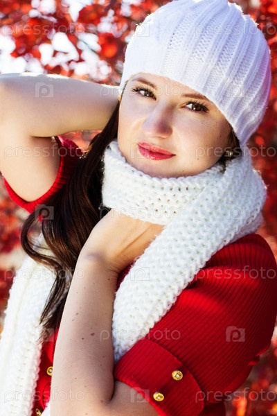 Портрет красивой молодой женщины в белой зимней одежде