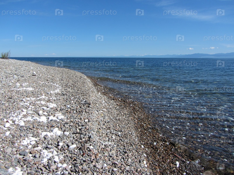 Солнечный берег с галькой и прозрачной чистой водой