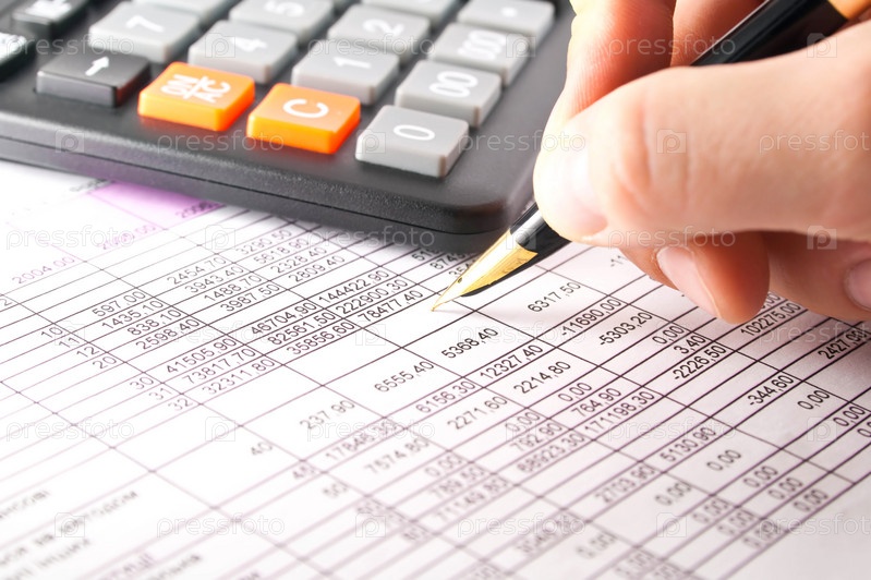 Таблица,калькулятор, и рука с шариковой ручкой