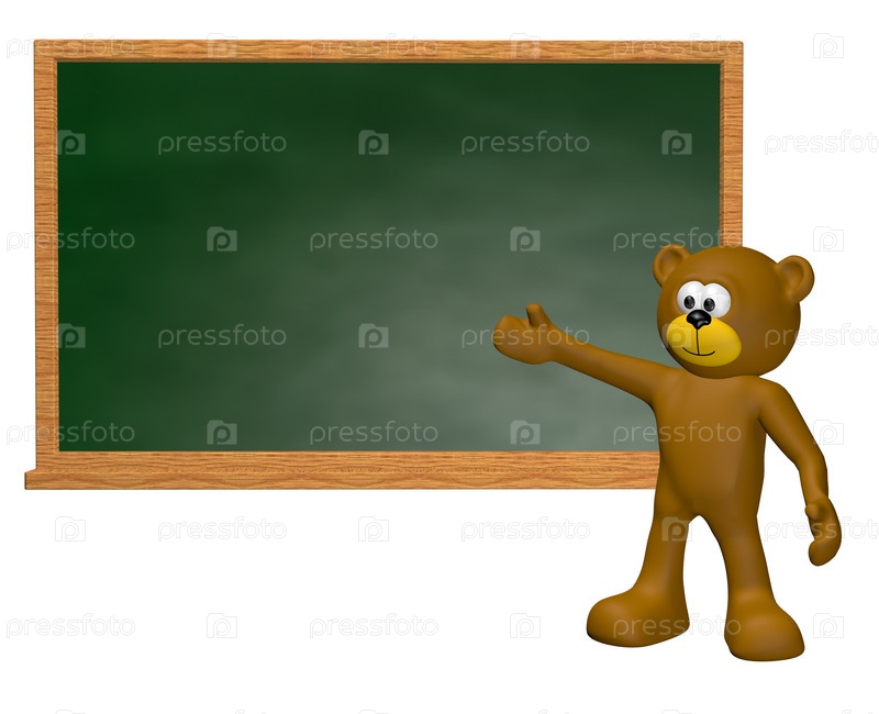 плюшевый медведь перед зеленой школьной доской. 3D иллюстрация