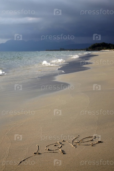 Слово «любовь» на песке на фоне начинающегося шторма