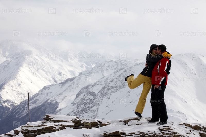 Лыжники на вершине горы. Гора Чегет, Россия, Кавказ