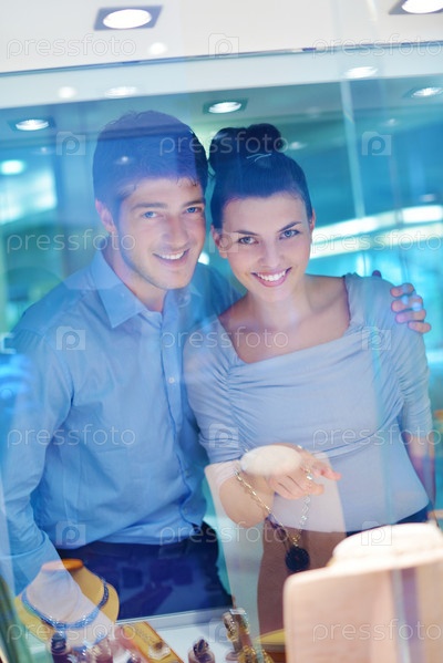 Счастливая молодая пара в магазине ювелирных изделий