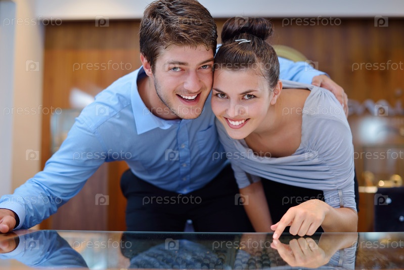 Счастливая молодая пара в магазине ювелирных изделий