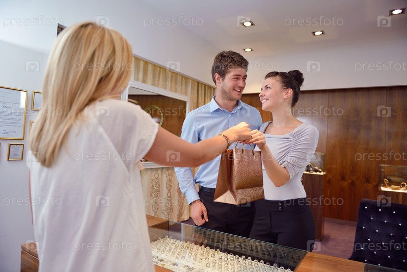 Счастливая молодая пара в магазине ювелирных изделий