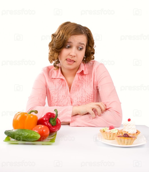 Женщина делает выбор между пирожными и овощами на белом фоне