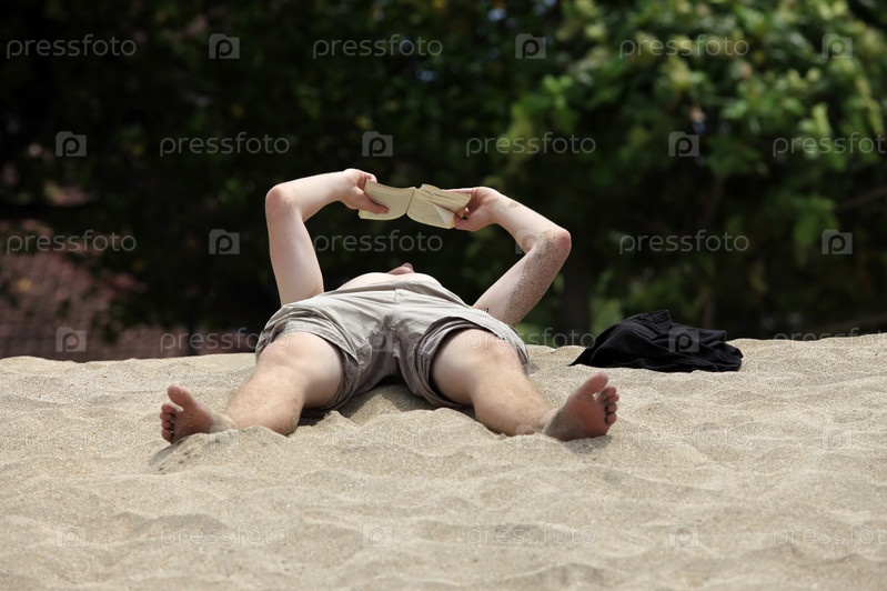 Мужчина на пляже читает книгу