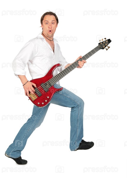 Молодой парень с бас-гитарой на белом фоне
