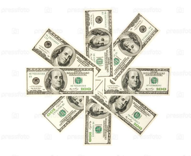 Доллары, выложенные снежинкой, на белом фоне