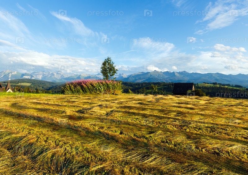 Поле со скошенной травой на фоне гор летним вечером