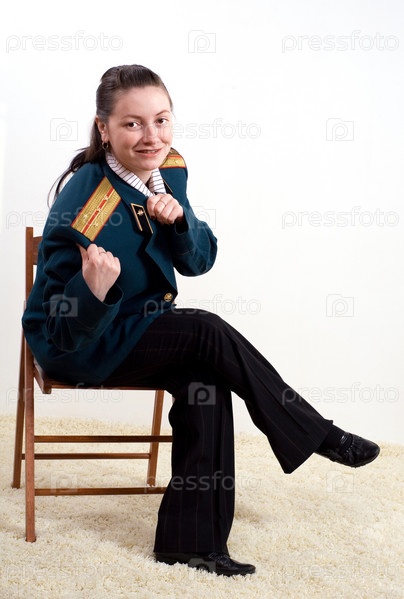 Девушка сидит в форме с погонами на белом фоне