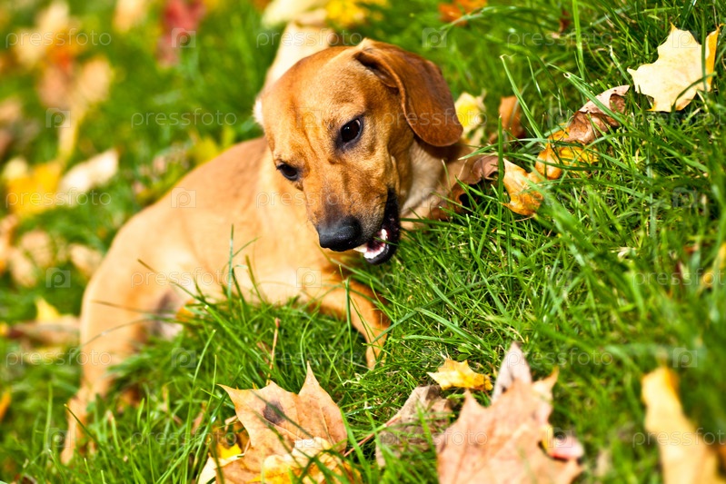 Милый щенок таксы на зеленой траве с осенними листьями клена