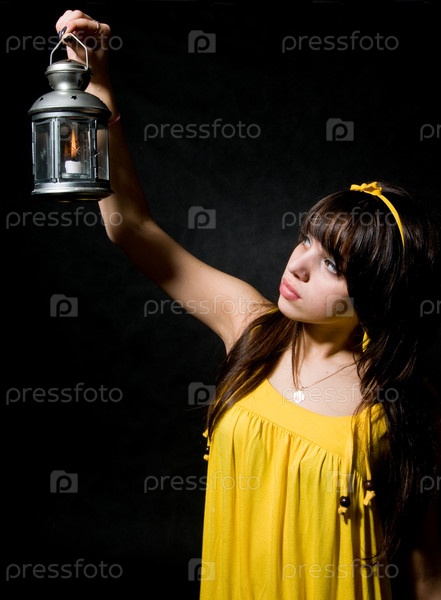 Девочка-подросток держит зажженый фонарь, на черном фоне