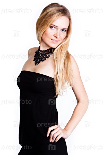 Молодая и красивая женщина со светлыми волосами в черном коктейльном платье на белом изолированном фоне