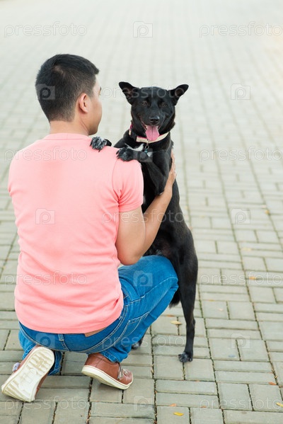 Владелец обнимает свою собаку