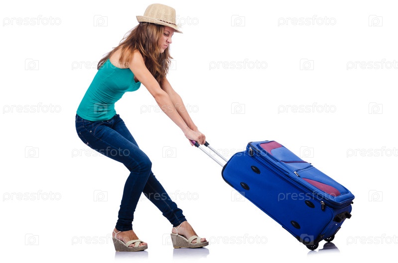 Молодая девушка с чемоданом на белом фоне