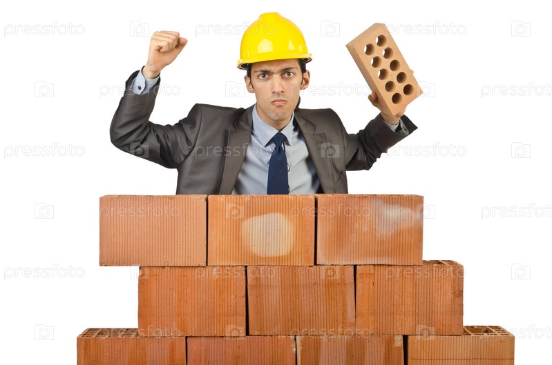 Бизнесмен с кирпичами на белом фоне