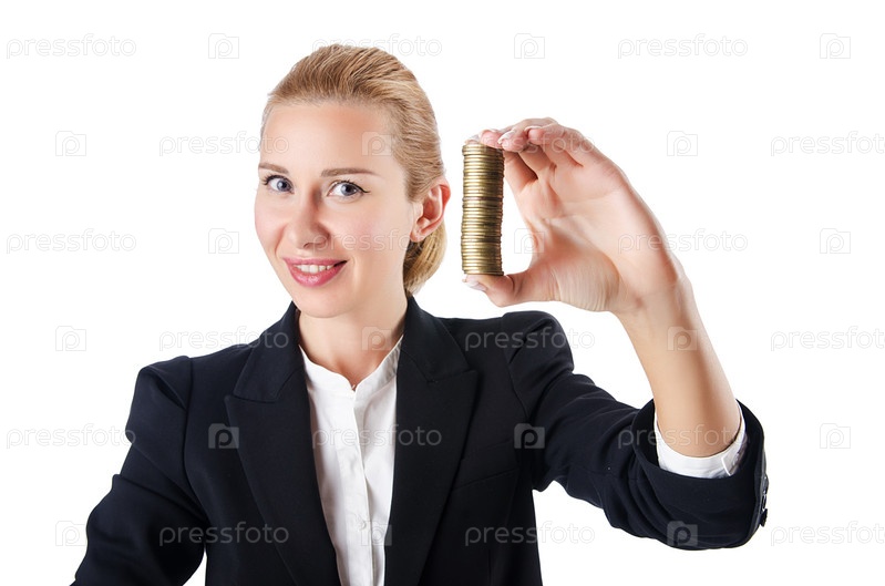 Женщина с монетами на белом фоне