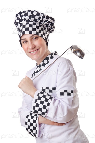Женщина-повар с половником на белом фоне