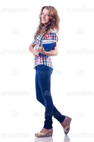 Молодая студентка на белом фоне