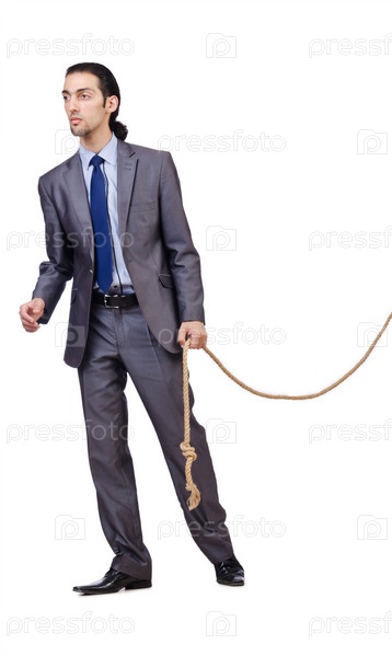Бизнесмен с веревкой в руке на белом фоне