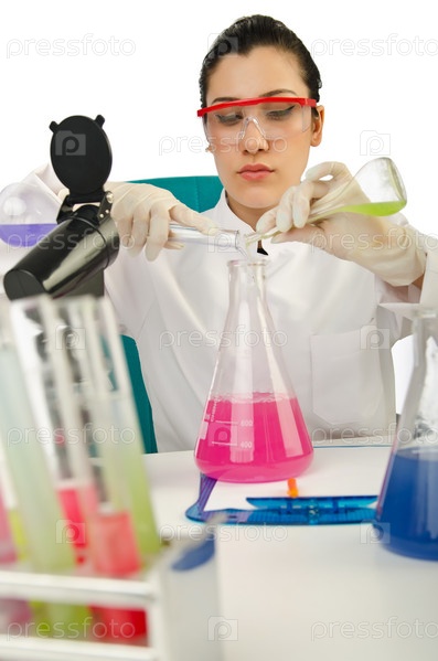 Женщина-химик в лаборатории на белом фоне