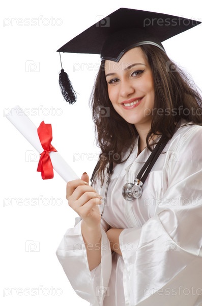 Выпускница с дипломом на белом фоне