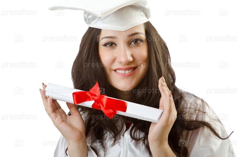 Выпускница с дипломом на белом фоне