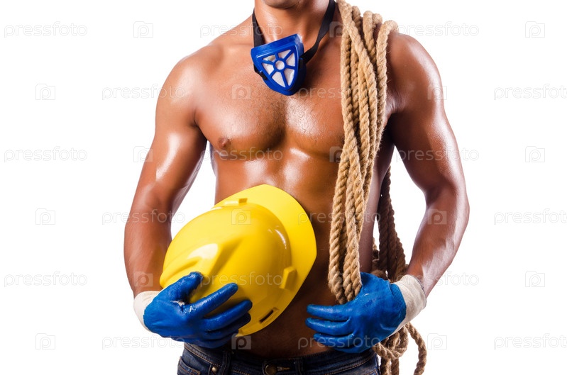 Мускулистый строитель с инструментами на белом фоне