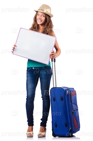 Молодая девушка с чемоданом на белом фоне